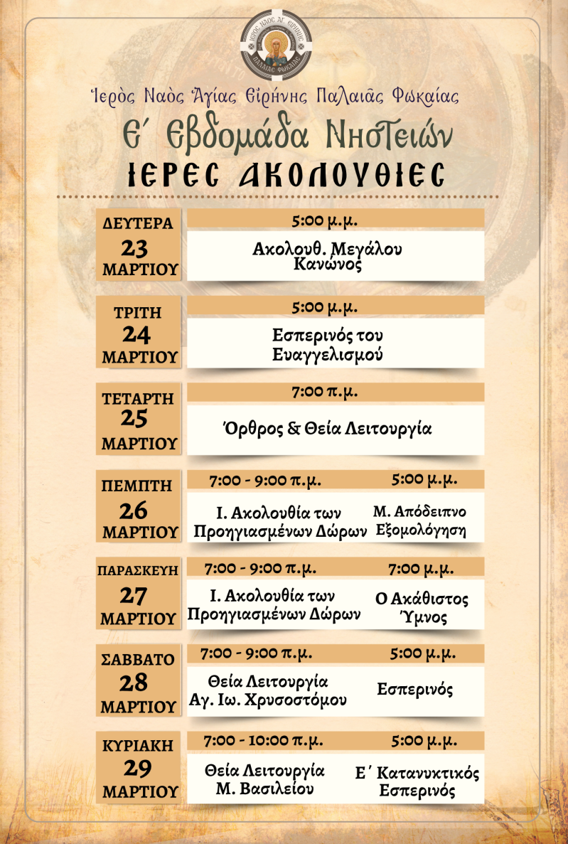 | 29 | ΚΥΡΙΑΚΗ | Ε΄ Κατανυκτικός Εσπερινός | 5:00 μ.μ. | Ε΄ Κατανυκτικός Εσπερινός |