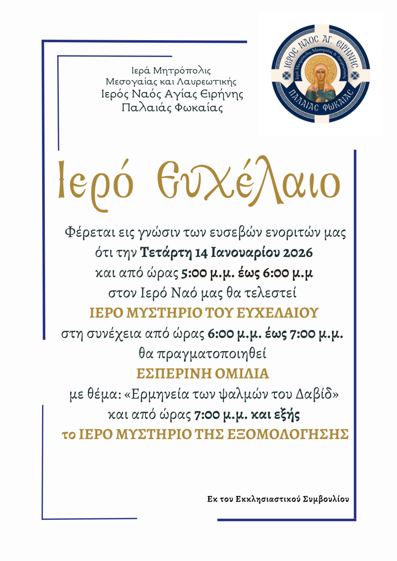 Καλώς ήλθατε στη σελίδα ωραρίου Λειτουργίας για τον Ιερό Ναό Αγίας Ειρήνης Παλαιάς Φωκαίας.